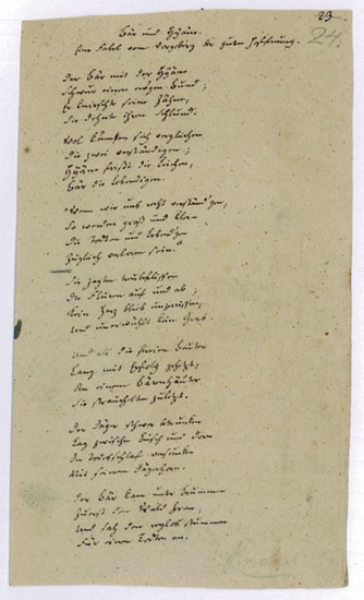 "Bär und Hyäne. Eine Fabel vom Vorgebirg der guten Hoffnung." Eigenh. Gedicht. O. O. u. D. 16 vierzeilige Strophen auf 2 SS. 8vo. "Der Bär mit der Hyäne | Schwur einen ew'gen Bund; | Er knirschte seine Zähne, | Sie dehnte ihren Schlund. | Wohl können sich vergleichen | Die zwei verständigen; | Hyäne frißt die Leichen | Bär die Lebendigen [...]". - Erstdruck im Deutschen Musenalmanach für das Jahr 1834.