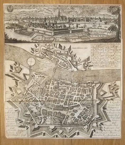 "Abbildung des großen Brandes zu Franckfurt am Mayn in der sogenanten Bockgassen in der Nacht vom 26. auf den 27. Juny um 11 Uhr.".". Kupferstich. 1719 ff. Ca. 38 cm x 32,5 cm. Das Blatt vereint zwei schöne Gesamtansichten von Frankfurt am Main zum großen Brand, der die Stadt vom 26. und 27. Juni 1719 heimsuchte: das obere Blatt zeigt eine Ansicht der in Flammen stehenden Stadt mit Sachsenhausen im Vordergund, das untere Blatt die Stadt aus der Vogelperspektive mit dem zerstörten und noch immer brennenden Stadtviertel. - Allseitig knapp beschnitten und teils auf altes Papier kaschiert. Gebräunt.